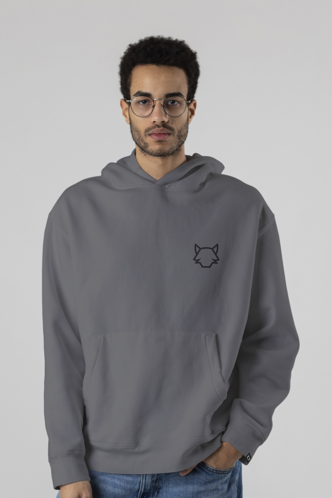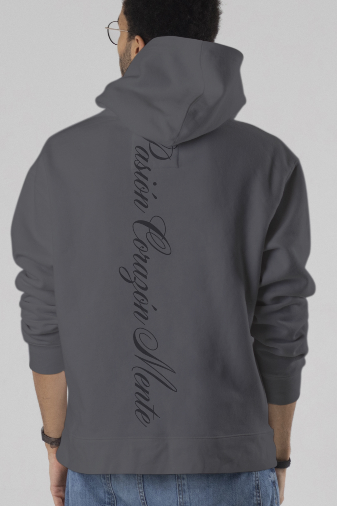 Características: Polerón gris con capucha y bolsillo frontal tipo canguro. Emblema del lobo en el pecho y mensaje caligráfico estampado en espalda tipo Script de Pasión, Corazón y Mente. Estilo urbano con carácter y fuerza visual.