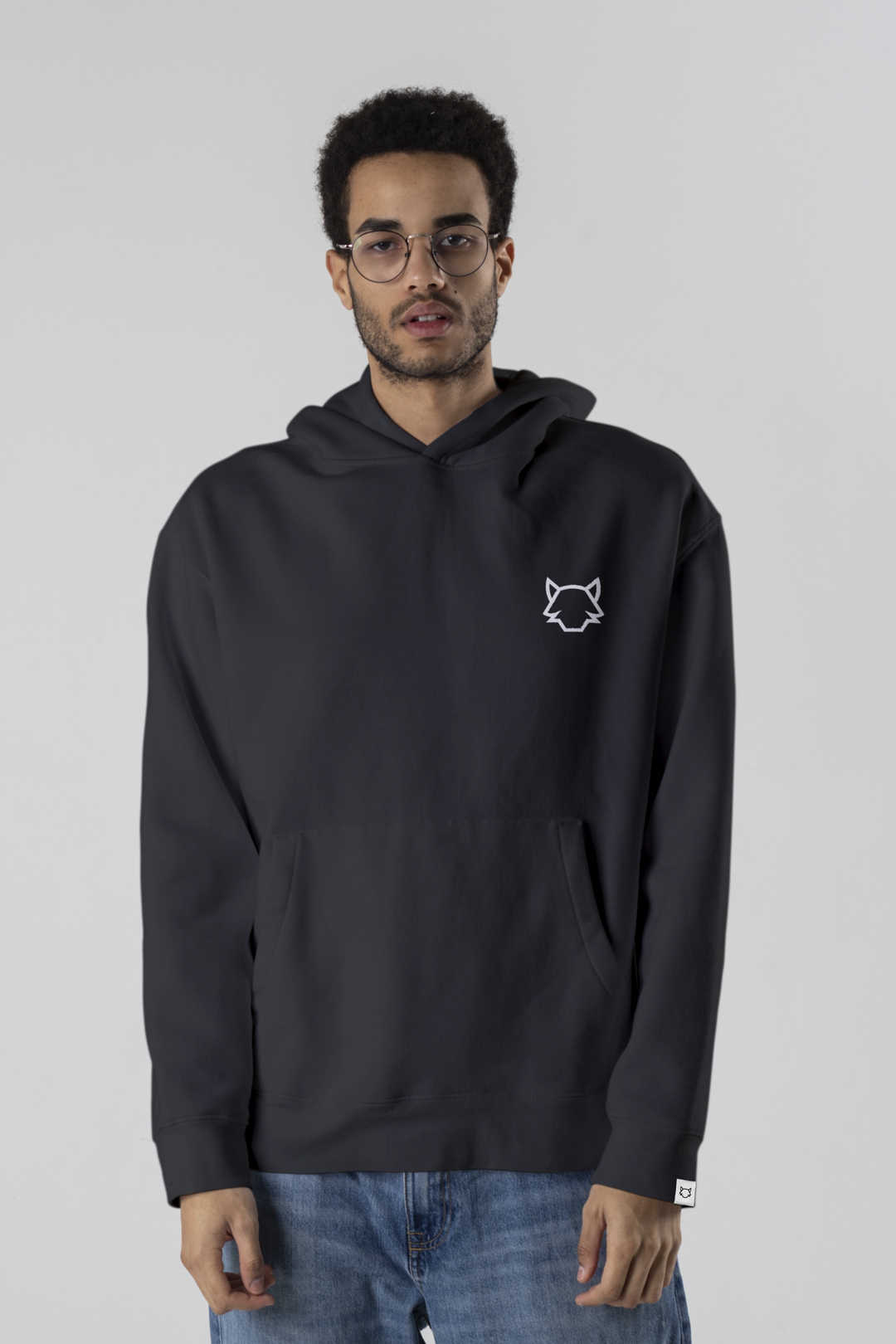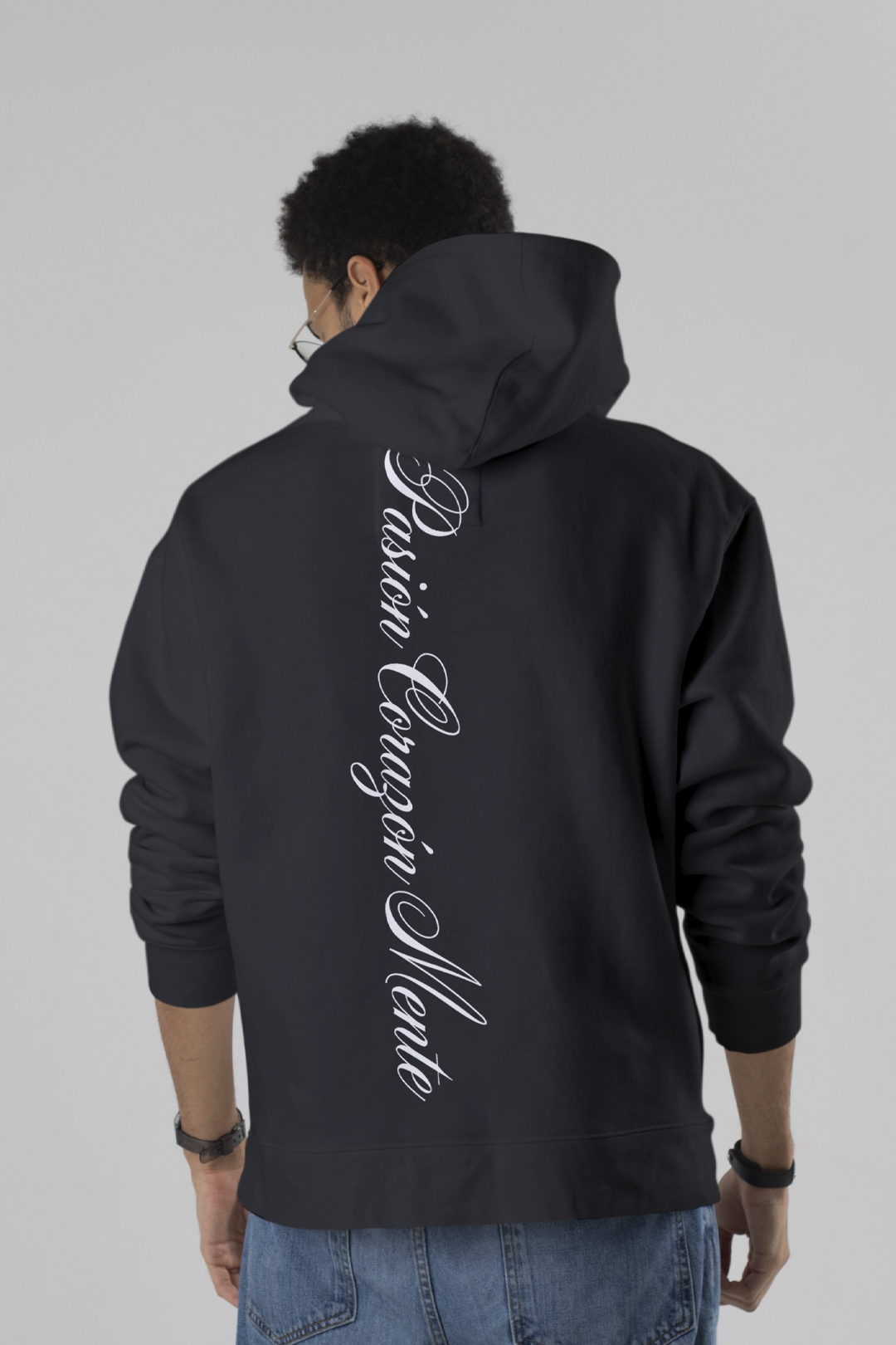 Características: Polerón negro con capucha y bolsillo frontal tipo canguro. Emblema del lobo en el pecho y mensaje caligráfico estampado en espalda tipo Script de Pasión, Corazón y Mente. Estilo urbano con carácter y fuerza visual.
